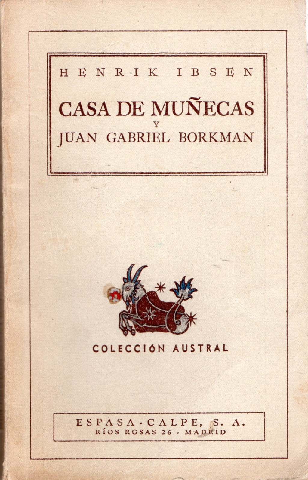 Casa de muñecas y Juan Gabriel Borkman (Espasa-Calpe, 1941), de Henrik Ibsen, son dos obras de teatro distintas del mismo autor aunadas en el mismo libro, de las cuales desconozco el traductor. Este libro se imprimió en Buenos Aires (Argentina) hace ya casi ochenta años, y aunque está amarillento y parece viejo y raído, contiene la firma de su anterior dueño (por cierto, alguien con varias entradas en Google).
